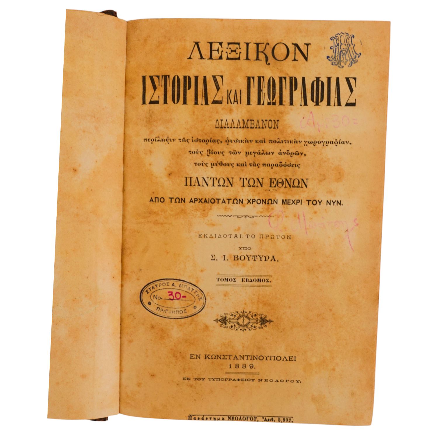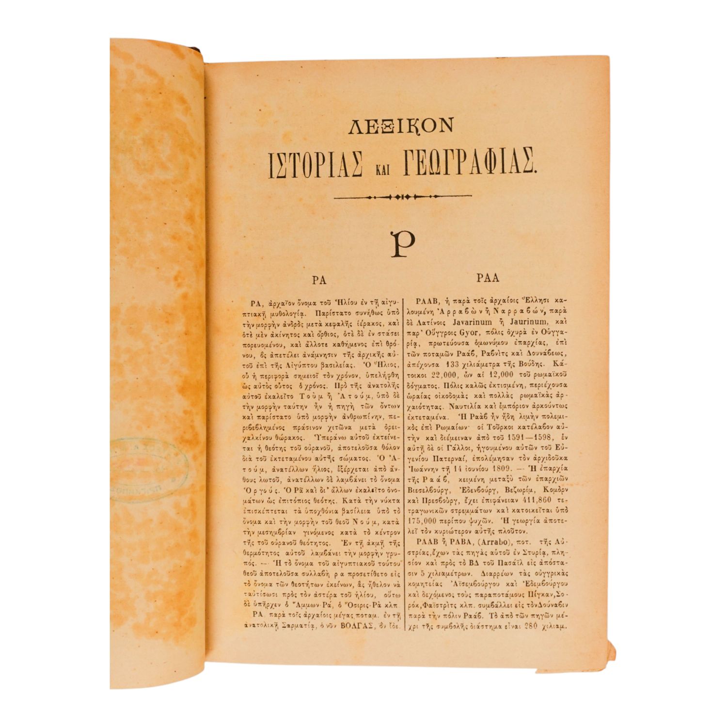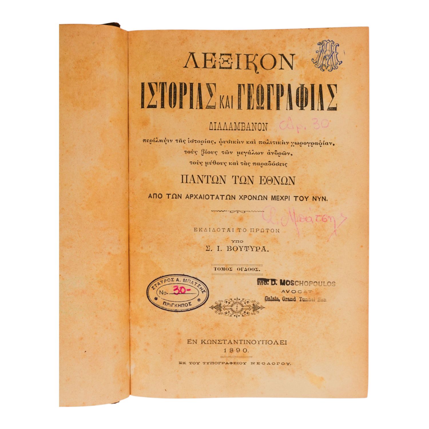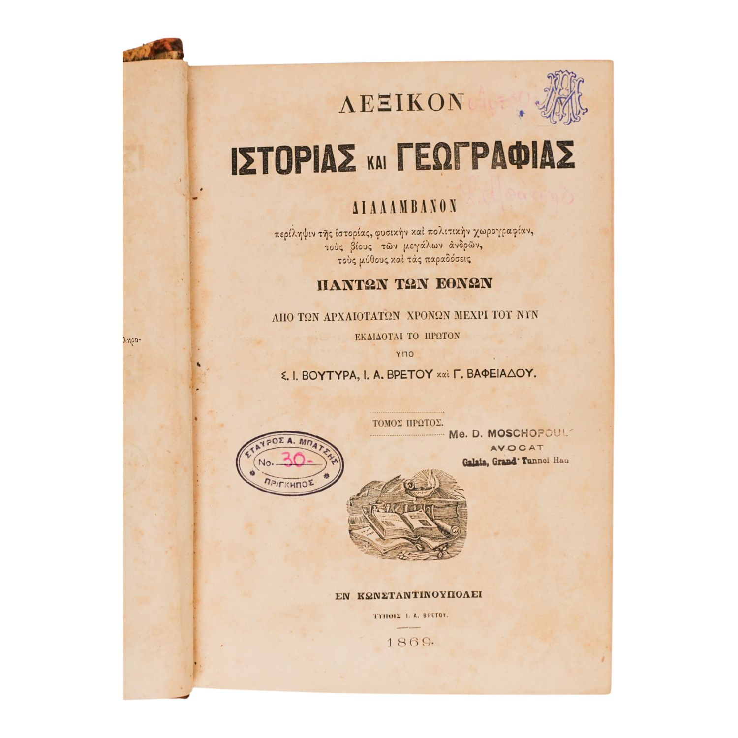 İstanbul´da 1869 yılında basılmış, Rumca Tarih ve Coğrafya sözlüğü...