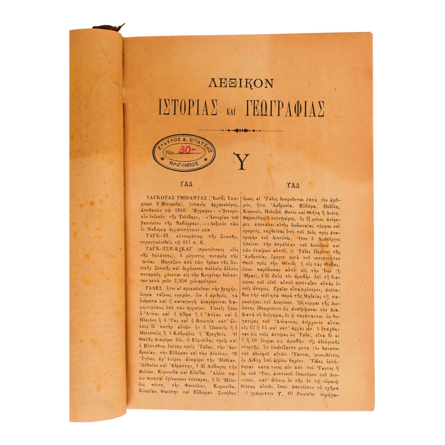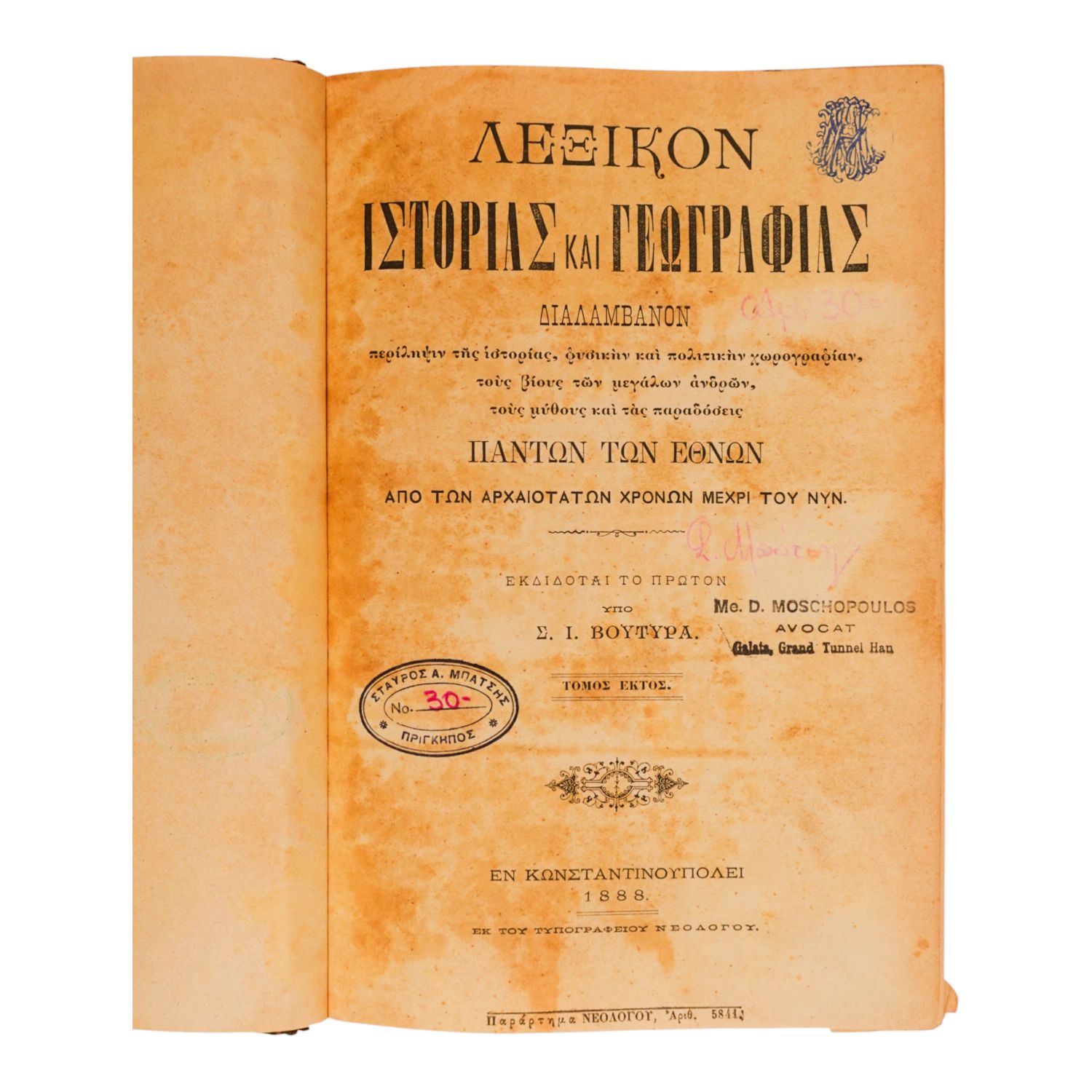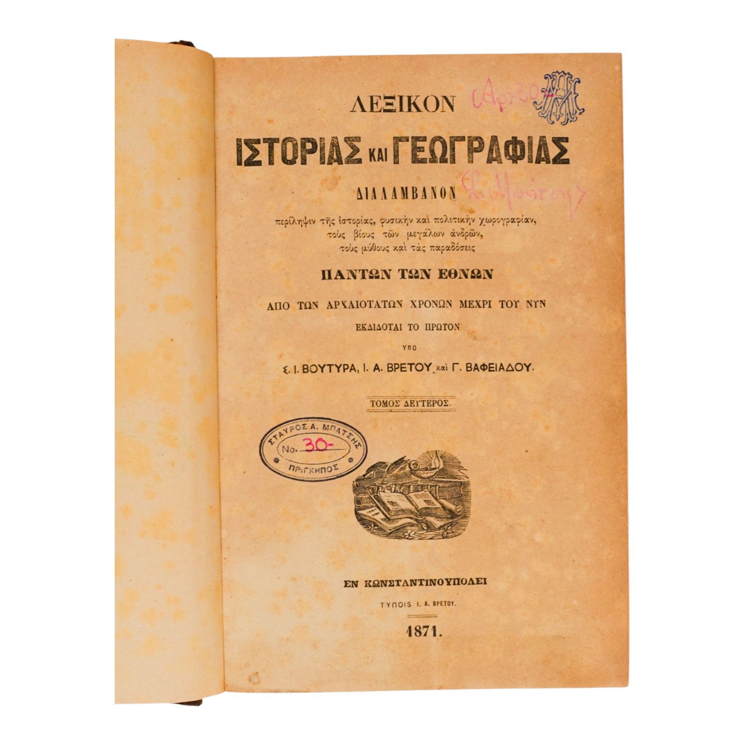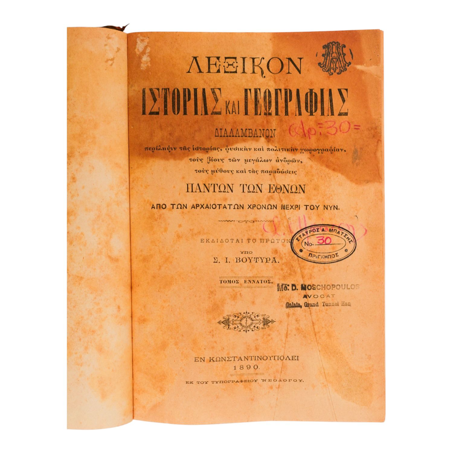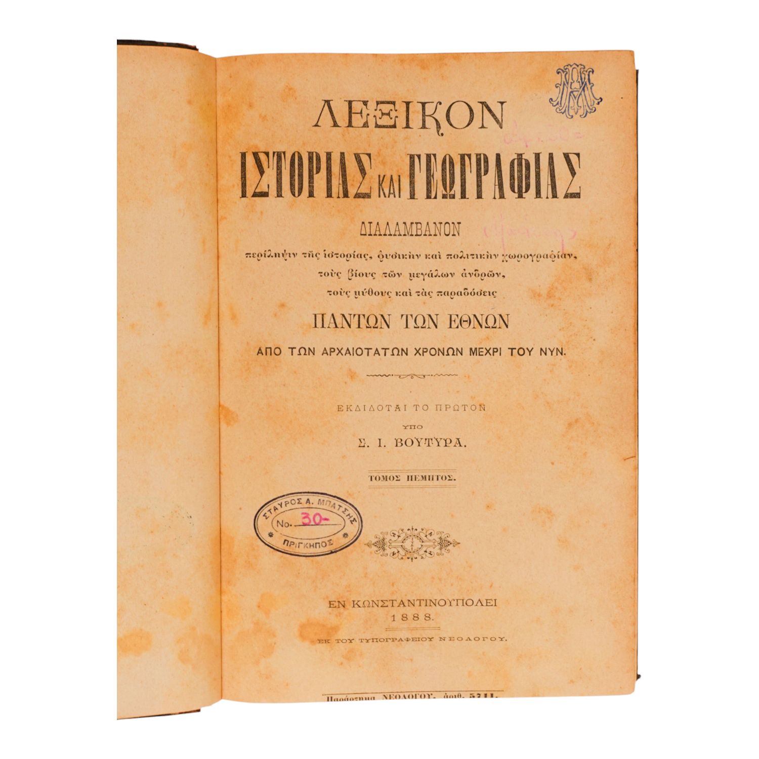 İstanbul´da 1869 yılında basılmış, Rumca Tarih ve Coğrafya sözlüğü...