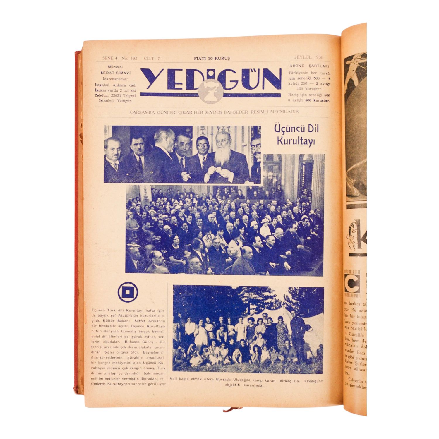 Kurucusu Sedat Simavi´den ithaflı ve imzalı YEDİGÜN dergisinin 11 Mart 1936 ila 2 Eylül 1936 tarihleri arasında yayımlanan 25 sayısı (157-182 arası), 24x33 cm...